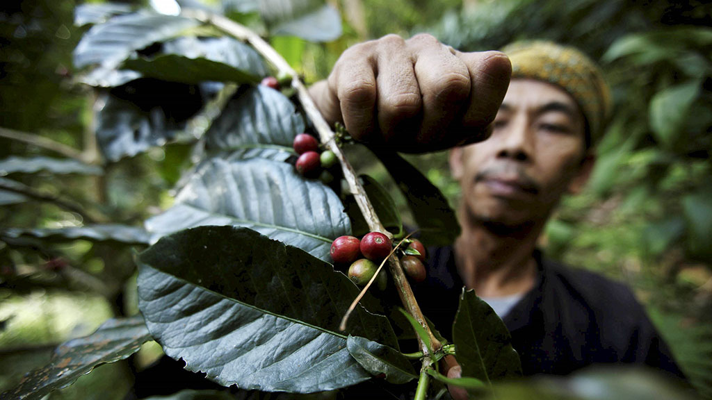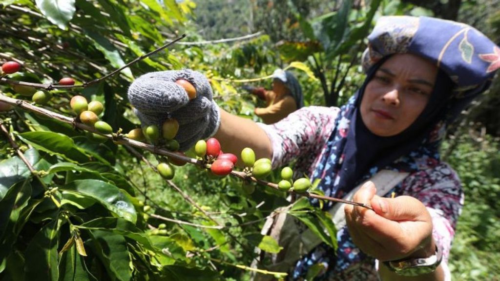 Farmers in Indonesia harvest coffee cherries, enhancing local livelihoods.